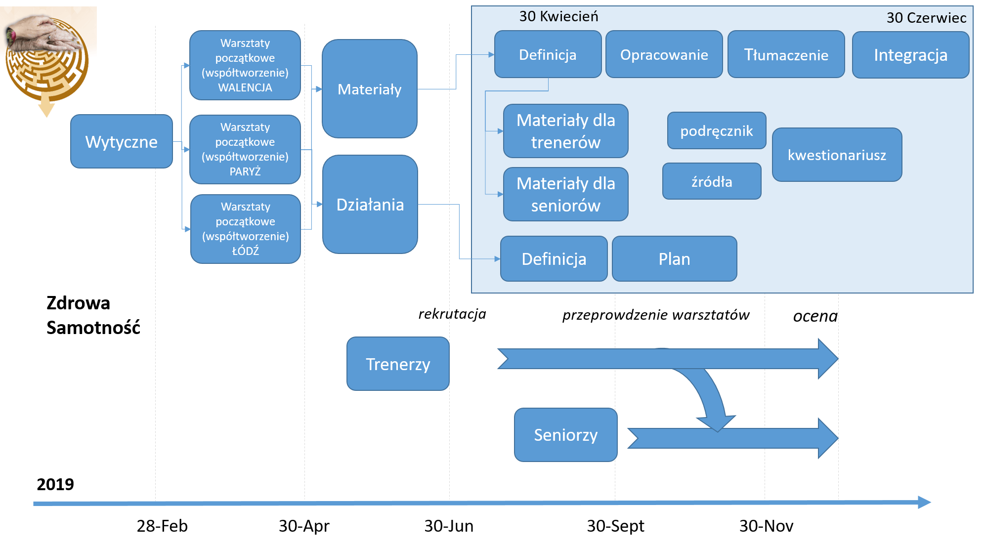 Na początku projektu przeprowadzone zostaną warsztaty (co-creation - współtworzenie), których celem jest określenie potrzeb osób starszych w kontekście poprawy ich jakości życia. Następnie zostaną opracowane materiały edukacyjne i rozpocznie się rekrutacja seniorów, którzy będą uczestniczyć w warsztatch. Warsztaty te odbędą się w trzech europejskich miastach (Walencja, Łódź i Paryż) i będą odbywać się w miejscach często uczęszczanych przez seniorów takich jak: centra kulturalne, centra aktywnego seniora lub stowarzyszenia osób starszych.